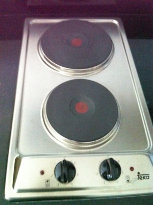 fitted kitchen with refrigerator, microwave, electric stove/hood