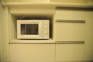 fitted kitchen with refrigerator, microwave