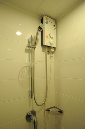 bathroom with walk-in shower + water heater
