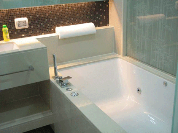 bathroom with bathtub + water heater